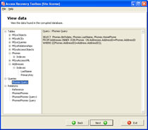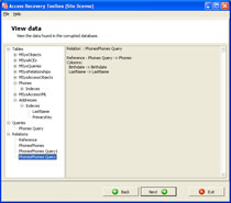 - Recovering information: it creates a new database specified by the user. It creates tables, queries and relations in this database according to the information obtained as a result of the analysis. Data with errors is not copied. It copies records from the tables of the source database to the tables of the target database.