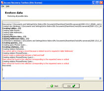 - Analyzing the read data: while recovering the database from the information read from the source file, the program restores relations between tables, the structure of user tables (field names and types, indexes) and the structure of queries (used tables and table fields, conditions, relations between tables used in the query). It also checks the integrity of tables and indexes, in case the integrity of indexes, the structures of table or query relations are corrupted, the program displays an error message (displayed in the log window).